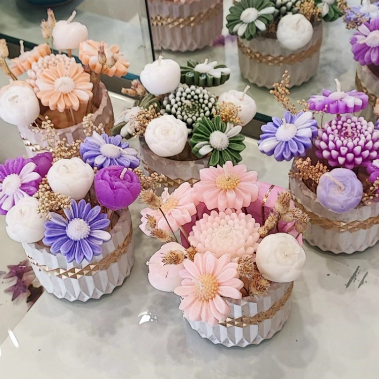 گلدان با گلهای شمعی بسیار زیبا مناسب هدیه دادن .گل ها ۶عدد میباشد شامل گلهای داوودی.مارگاریت و پیونی در رنگ های صورتی.بنفش.سبز قابل سفارش میباشد
